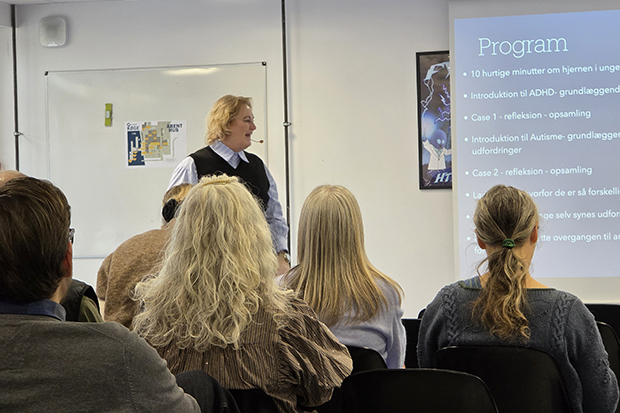 For at dykke ned i emnet havde skolen hyret konsulent Stine Hagedorn fra Psykologisk Ressourcecenter til at holde oplæg for skolens ansatte. Hun har over tyve års erfaring med unge med diagnoser som ADHD og autisme.