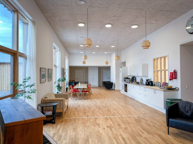 Beboerne i Møn Bakkeby bor i separate lejligheder og samles dagligt til fælles sociale og fysiske aktiviteter. Foto: Møn Bakkeby.